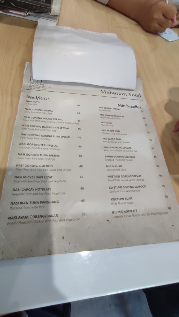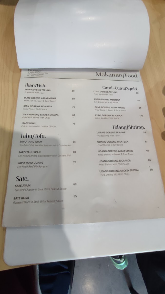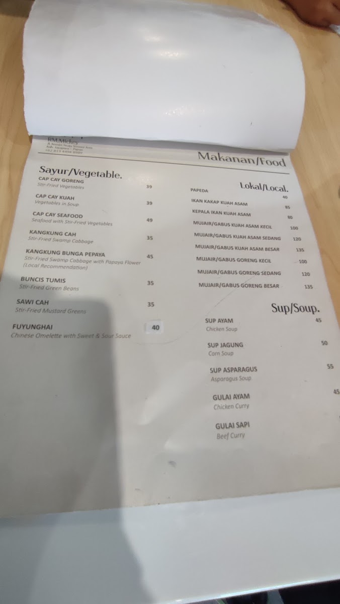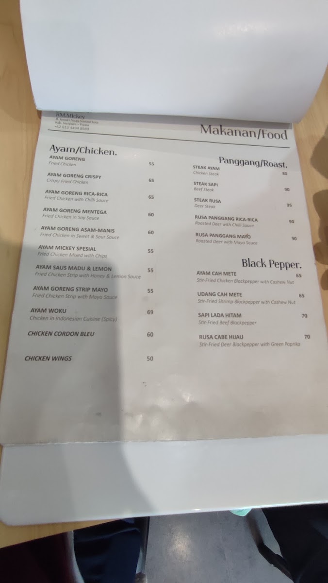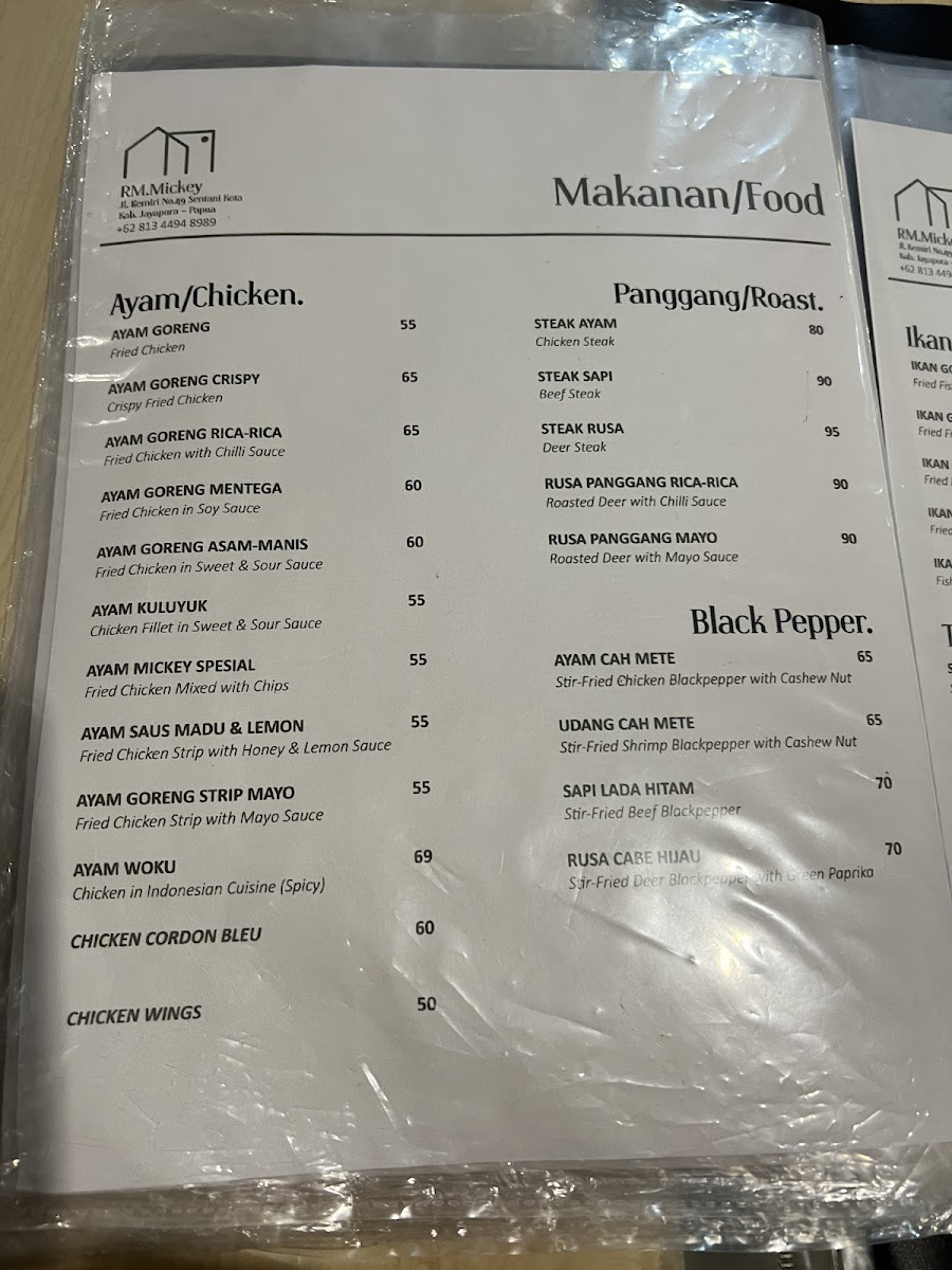 The menu at Rumah Makan Mickey in Sentani offers a diverse range of dishes that cater to various tastes, perfect for anyone visiting this popular restaurant. Among the standout items is Sapi Lada Hitam Udang Goreng Mentega Capcay Kuah, a flavorful combination of beef, shrimp, and vegetables in a savory black pepper sauce, sure to satisfy those who enjoy rich and spicy flavors. Another crowd favorite is the Udang Goreng Spesial Mickey, a special fried shrimp dish that delivers a crispy texture and delightful taste. For soup lovers, the Soup of the Day provides a refreshing change, offering something different each day.